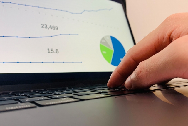グラフが表示されたノートパソコンを操作している手