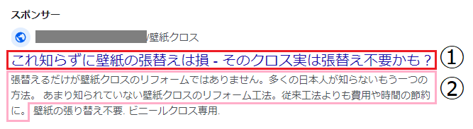 ①の赤枠が広告の「見出し」②のピンク枠が「説明文」になります。